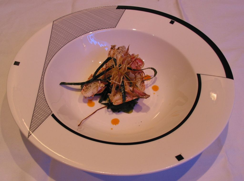 ROASTED SCAMI SEASONED WITH TEA AND SCAMPI OIL (Ceylon tea, Banyuls vinegar, wake, garnished with deep-fried leek and shredded nori)
