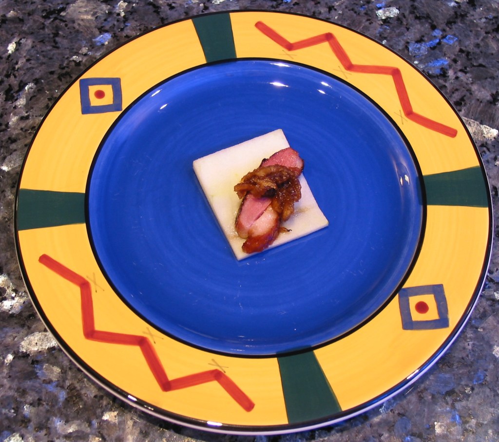 SMOKED DUCK BREAST ON APPLE TUILES AND GINGER SAUCE (Granny Smith apples, rice wine vinegar, mirin, apple juice, brown onion, garlic)