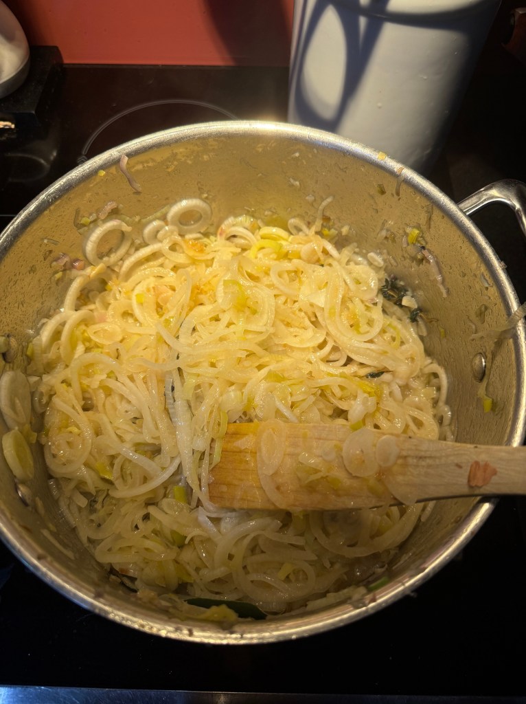 Lots of onions, shallots, & leeks with some thyme and bay leaves cooked on medium high for 5 minutes, “then reduce the heat to low and cook until caramelised … approximately 45 minutes.” They weren’t caramelised after 90 minutes, so I increased the heat to medium high and another 40 minutes later there were starting to caramelise, but not even close to richly brown. Curiously the onions in the recipe photo are translucent white. I am not sure whether the onions were meant to be only braised per the recipe title, or caramelised per the instructions.