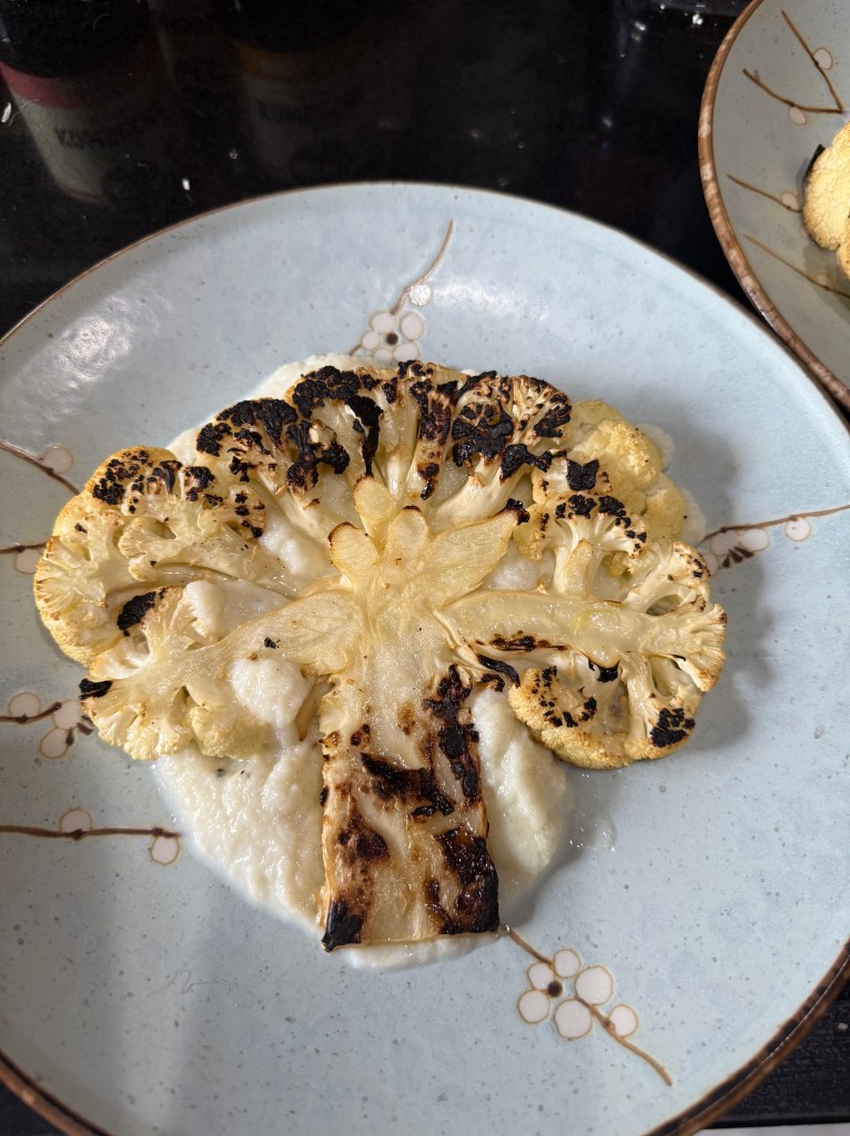 Large slices taken from the centre of a Cauliflower, fried until blackened, and then baked until soft.