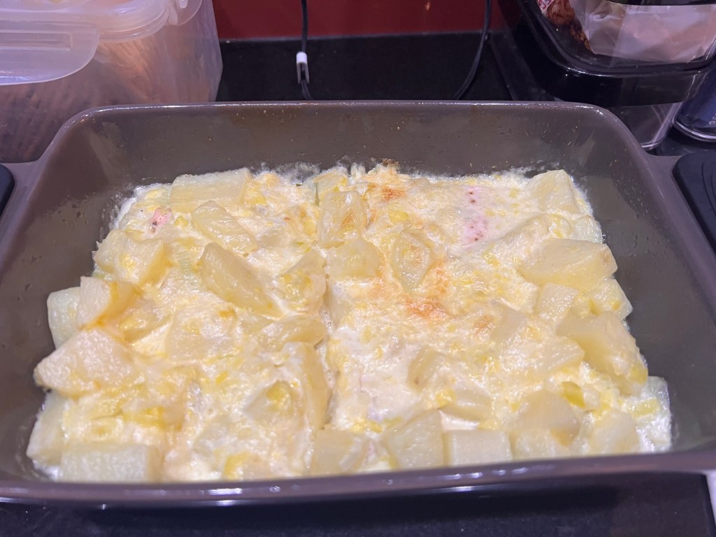 Put salmon in a casserole dish and cover with the cooked potato and cream mixture.