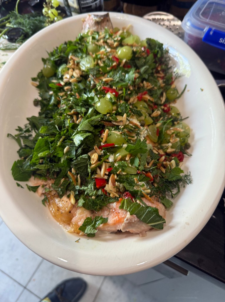 Salmon, labneh, almonds, grapes, chilli, capers, parsley, lemon juice.