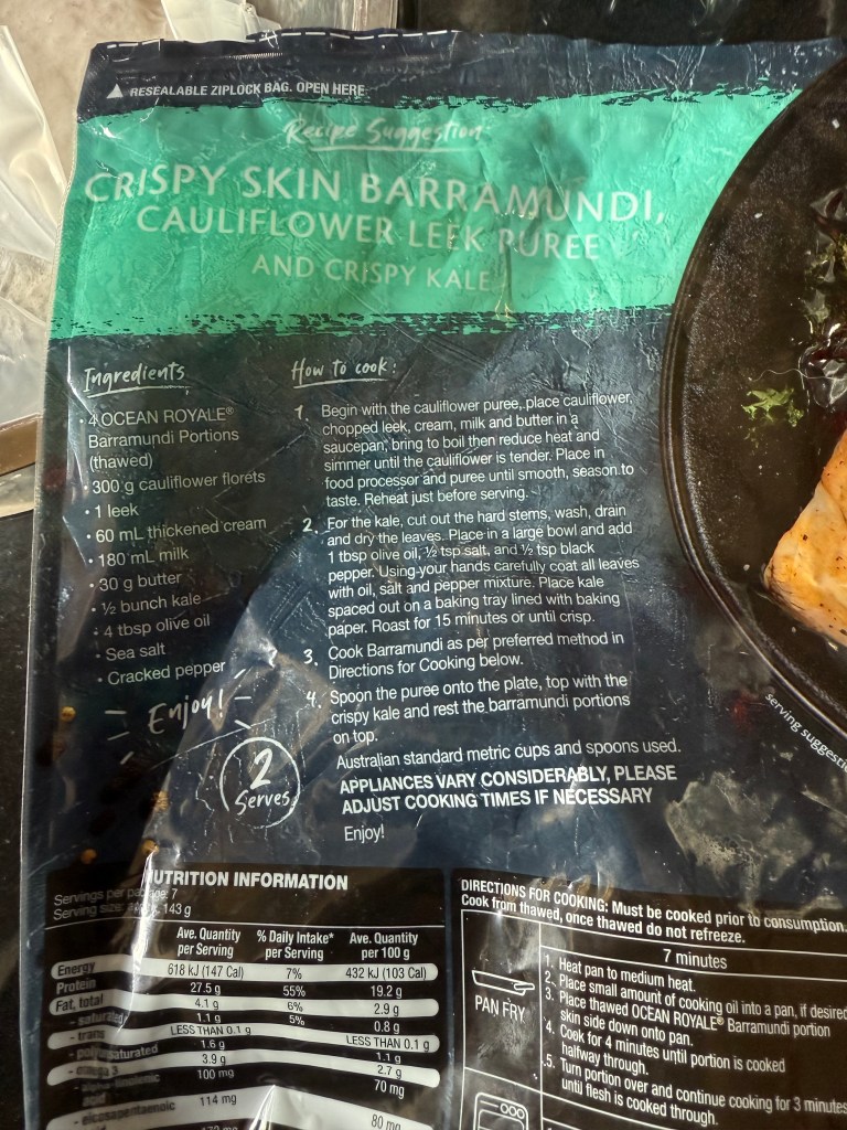 Packet recipe from the back of the Barramundi packet from Aldi. Barramundi are in individual vacuum sealed bags.