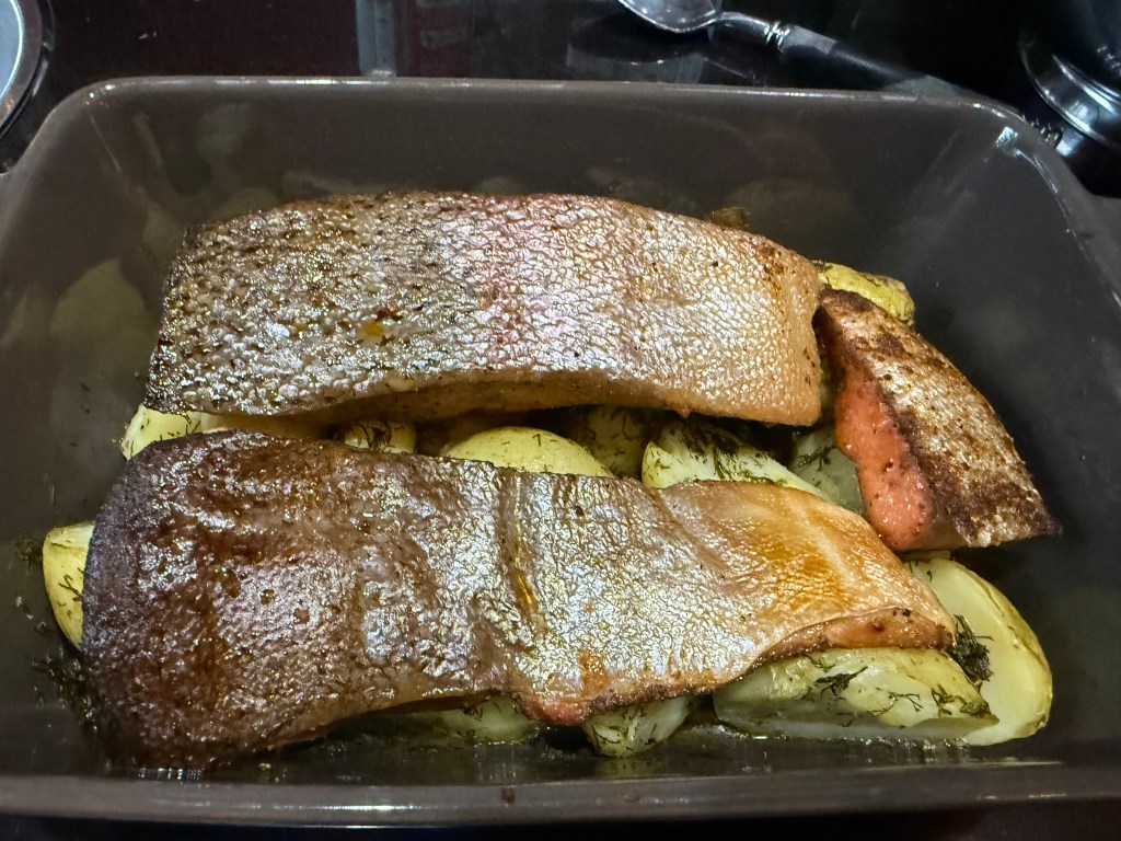 Cut the cooked potatoes in half and dress with EVVO / white wine vinegar, dill, & S & P and cook in oven at 200C until pale golden.