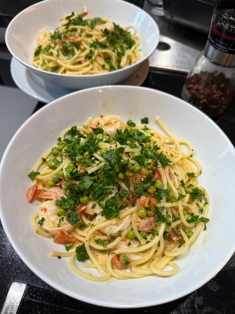 Heat double cream, garlic, diced tomatoes (not canned), S & P, then add frozen peas, prawns, lemon juice and zest and continue to heat until prawns cooked.