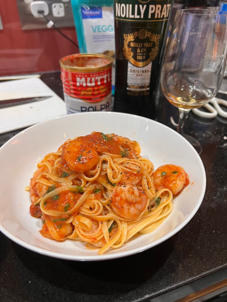 The prawns were then deglazed with Noilly Prat (rather than white wine following the series eats article) and finished cooking in the chopped tomatoes. Add the al dente pasta to the pan with the basil, and serve. Simple and quick.