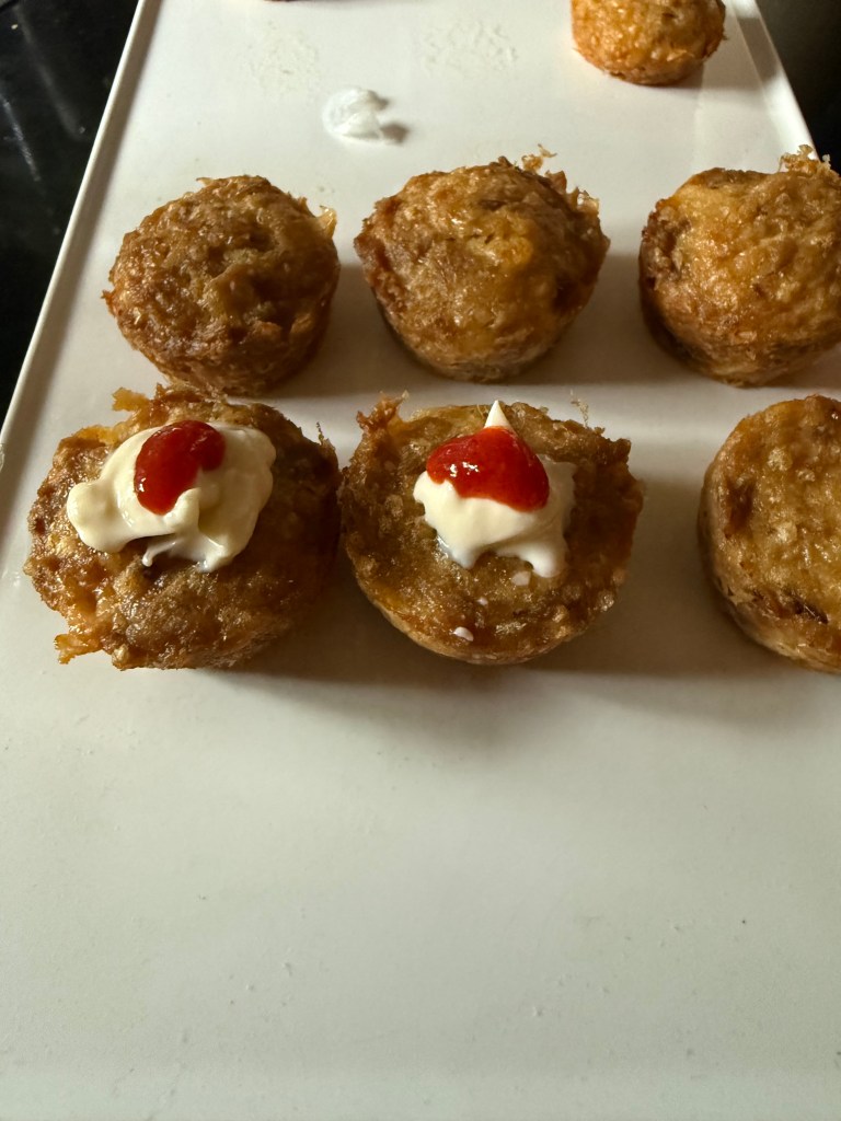 To make 36: Mix a can of Tuna 425g (preferably the ones in Olive Oil, and discard the oil) with 300g of Cheddar (I blended 3 types, (English, 12 months and 24 months)) with two Organic Eggs. Put in small muffin moulds and bake at 200C for 20m. Quantities don’t need to be exact.