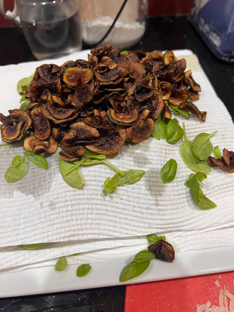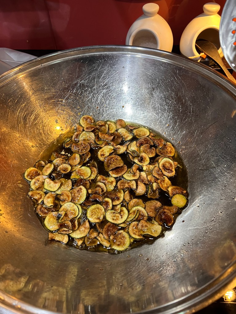 Use small zucchinis and slice very finely. Fry in EVOO. (Do in batches so that the oil does not get cold. For me, each batch was one zucchini). The zucchini are allegedly fried until “golden brown”. However I found this made the end result too brown, so I would suggest frying until slightly golden (next time).