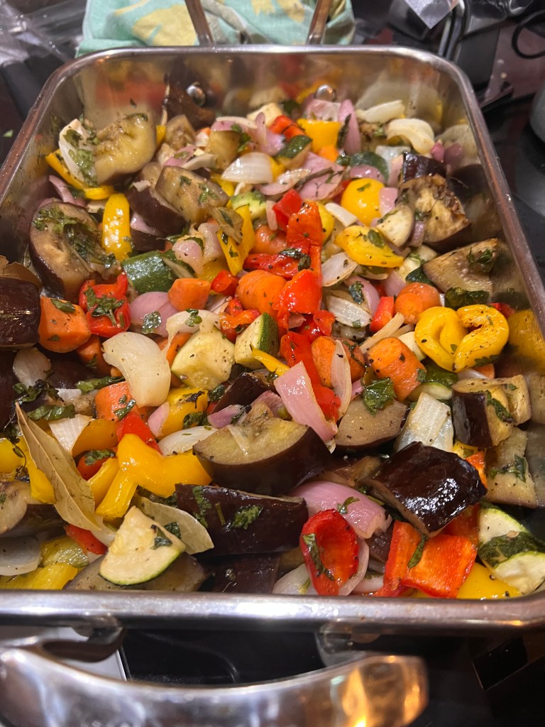 Slow roast (150C) for hour: EVOO, Zucchini, Onions (red and white), Red & Yellow capsicum, carrots, eggplant, parsley, Basel, thyme, oregano, bay leaves S &P.