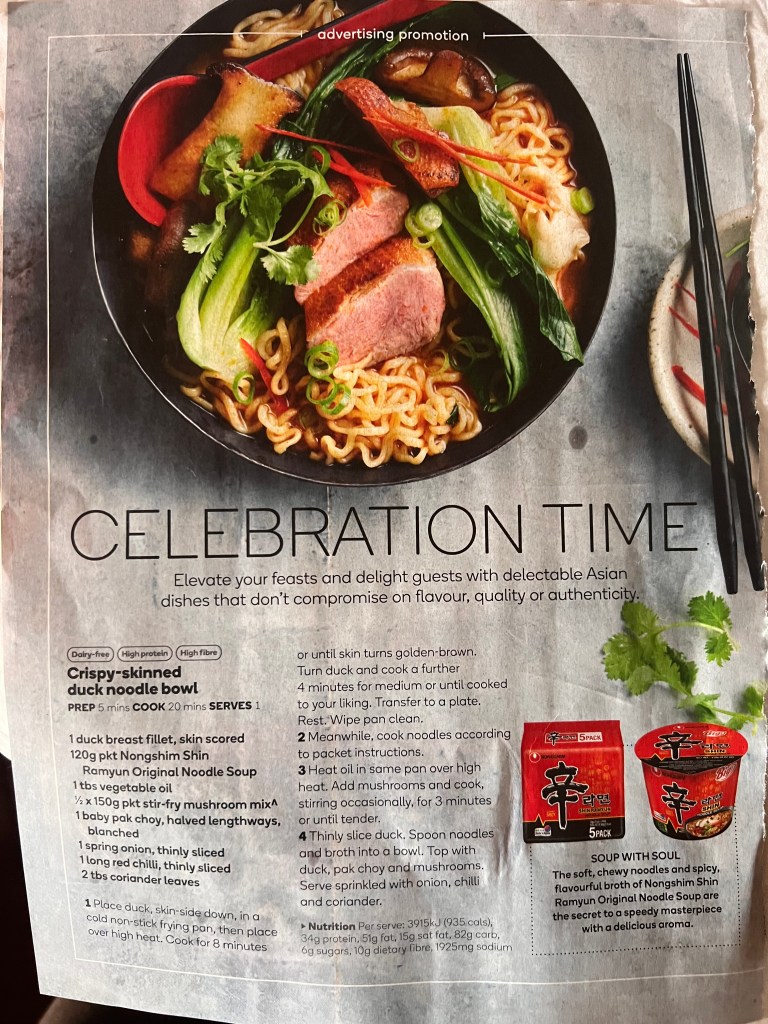 Ingredients: Duck breast, noodles, baby pak chou, spring onion, chilli, coriander leaves.