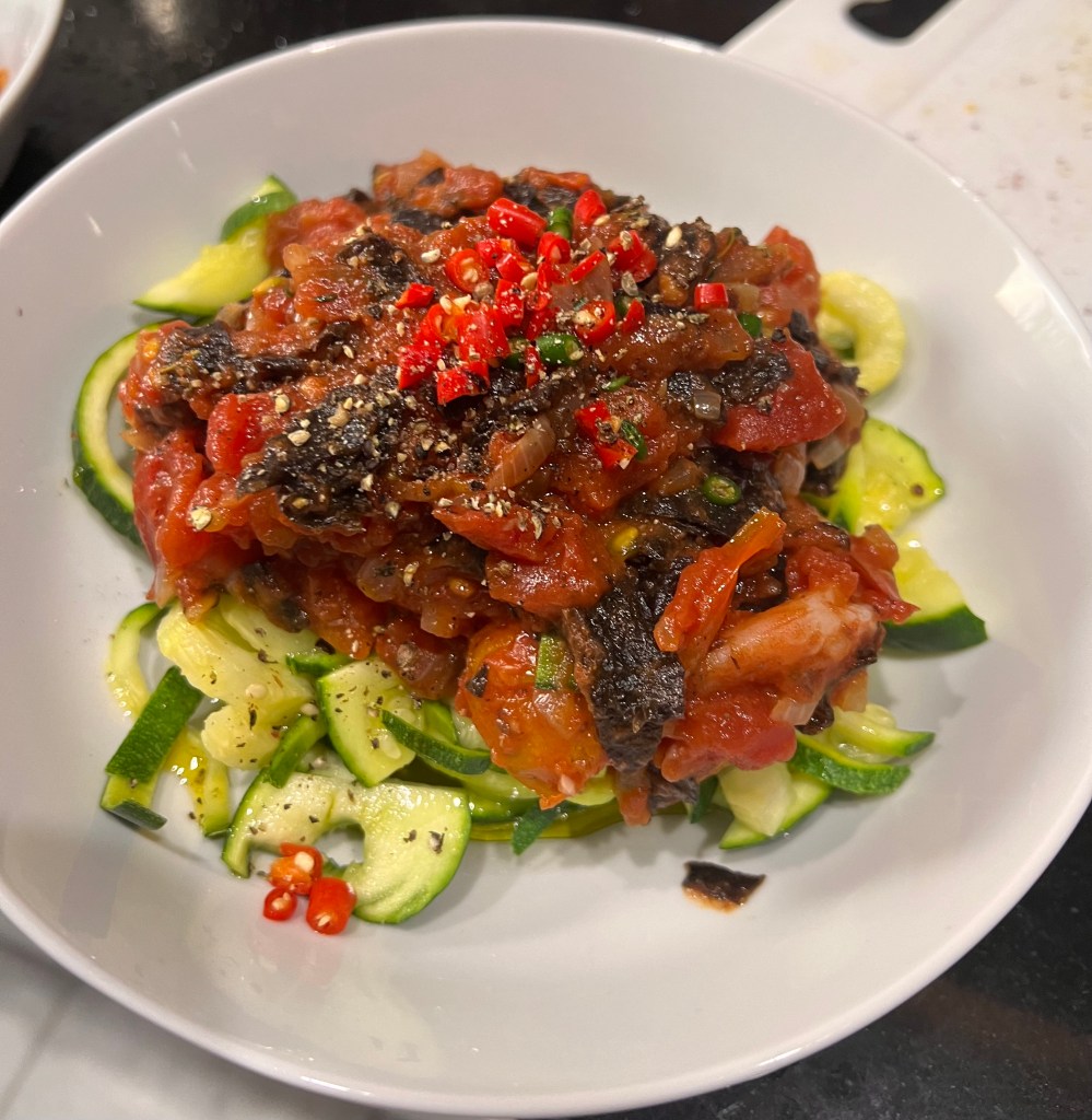 Ingredients: Prawns, EVOO, Onion, Garlic, Salted Anchovies, Thyme, Tomatoes, Prawns, Nori Sheets and Zucchini