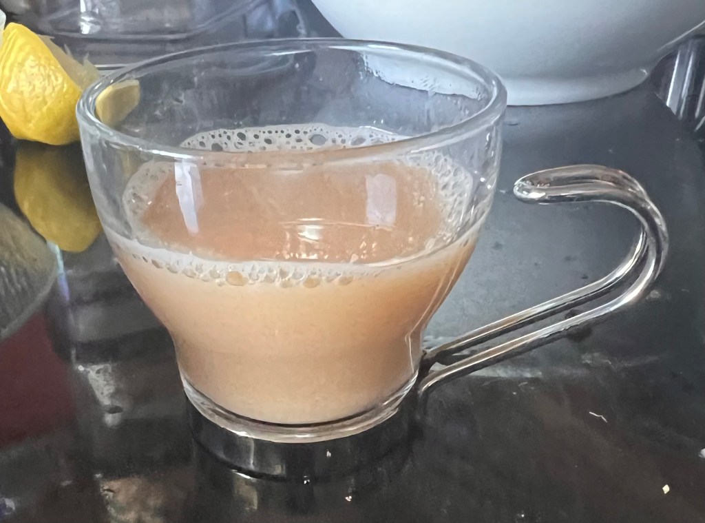 Even putting aside that the avocado was unripe (the choice I had was unripe or well past the best), and I added a lot more Tabasco, I have had better prawn cocktails, including the one in a previous post. I made the usual prawn bisque with the shells.