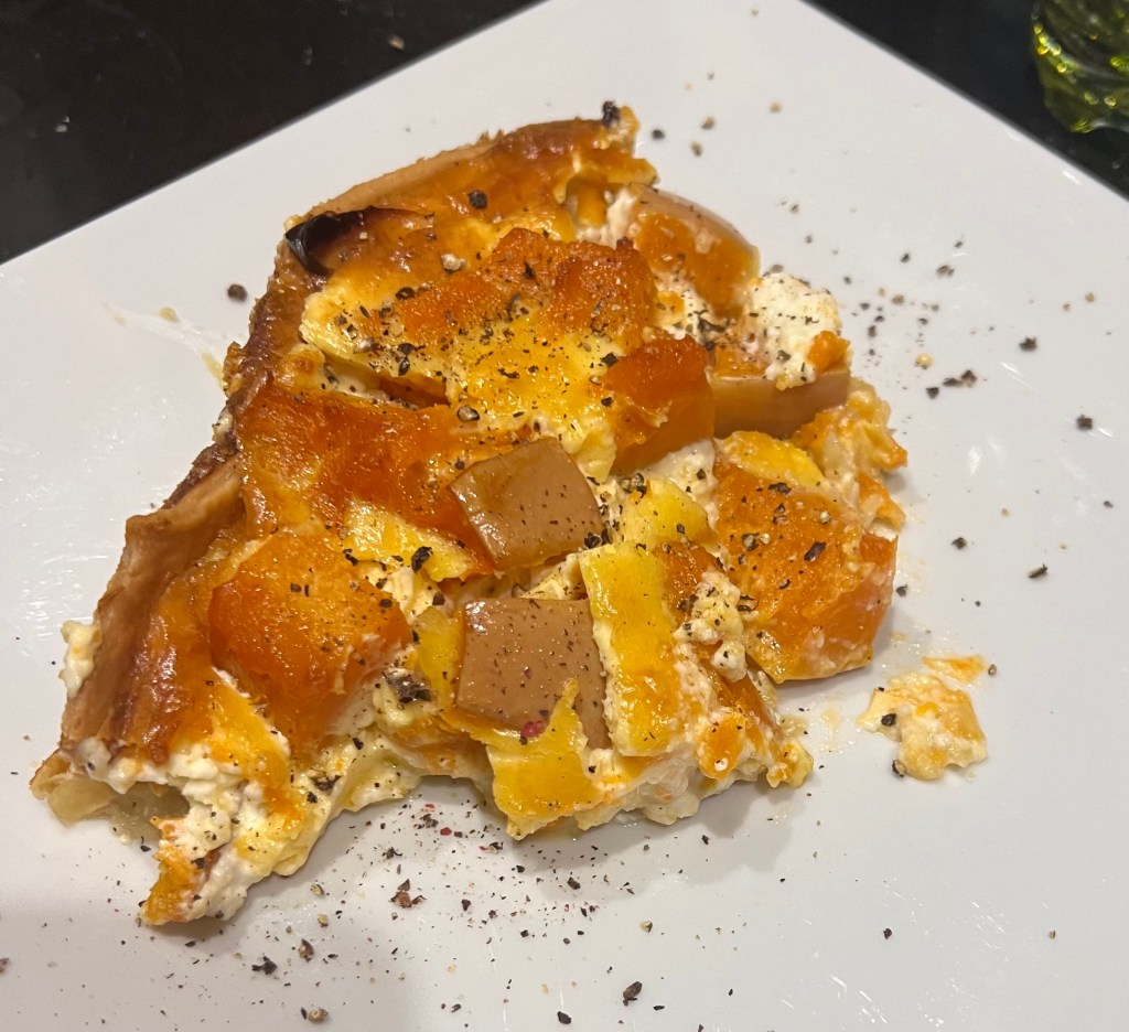 Shortcrust pastry, caramelised onions, Persian feta cheese, pumpkin, ouring cream, full cream milk, organic eggs.