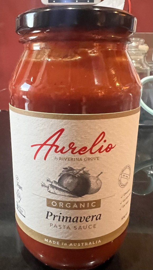 Take a jar of pasta sauce…. (Whilst I normally just use a can or organic tomatoes, some onion, garlic, and basil as my go to pasta sauce, I thought I would follow the recipe and choose an off the shelf pasta sauce. I choose this Aurelio, Organic Primavera, which was good if you have to choose a pre made sauce).