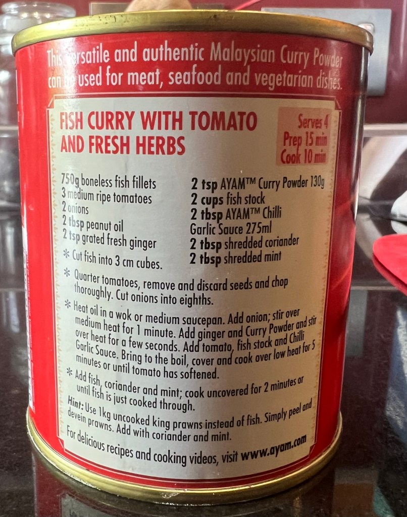 Ingredients: fish fillets, tomatoes, onions, peanut oil, ginger, curry powder, fish stock, chill, garlic, coriander, & mint.