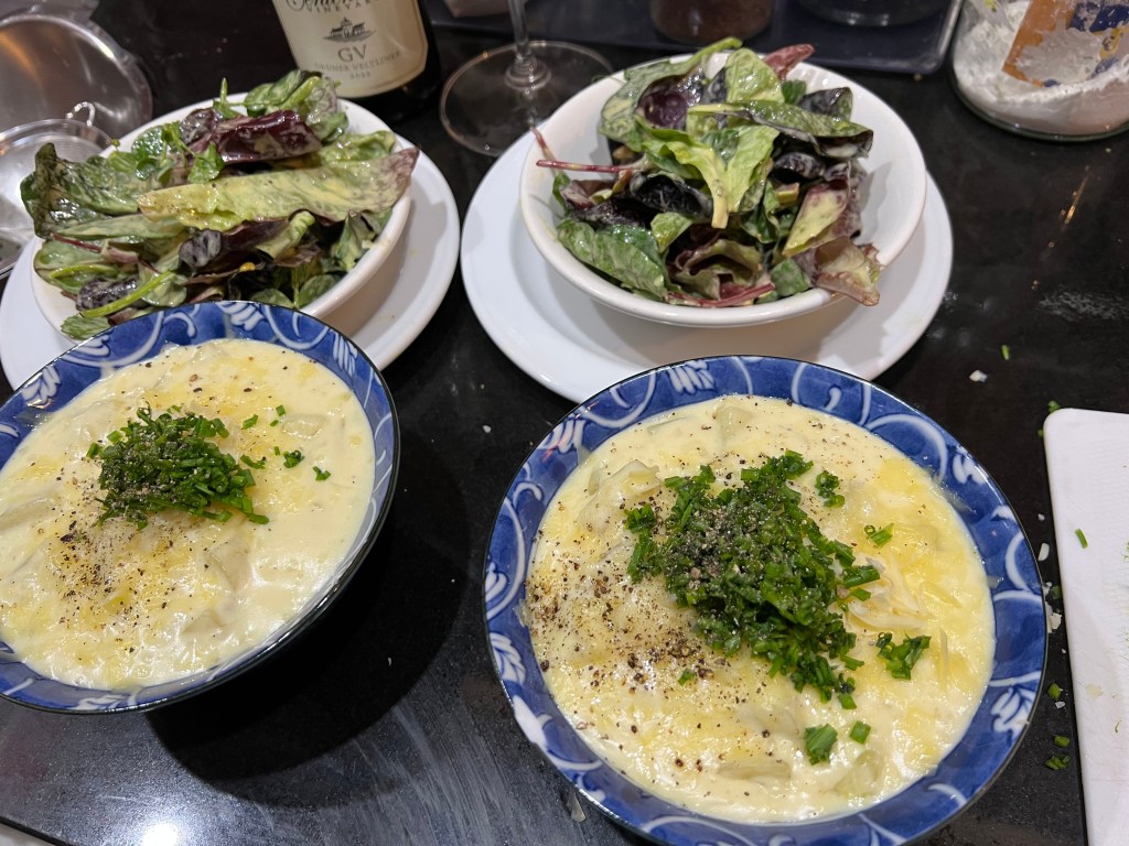 Ingredients: butter, onion, potatoes, flour, milk, nutmeg, chives, grated cheese & S&P.