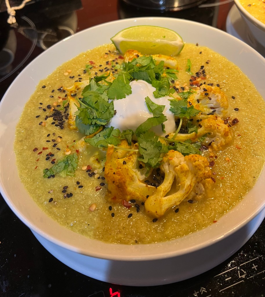 Ingredients: Coriander, onion, garlic, lime, turmeric, cumin, garam masala, black sesame seeds, vegetable stock, cauliflower and naan