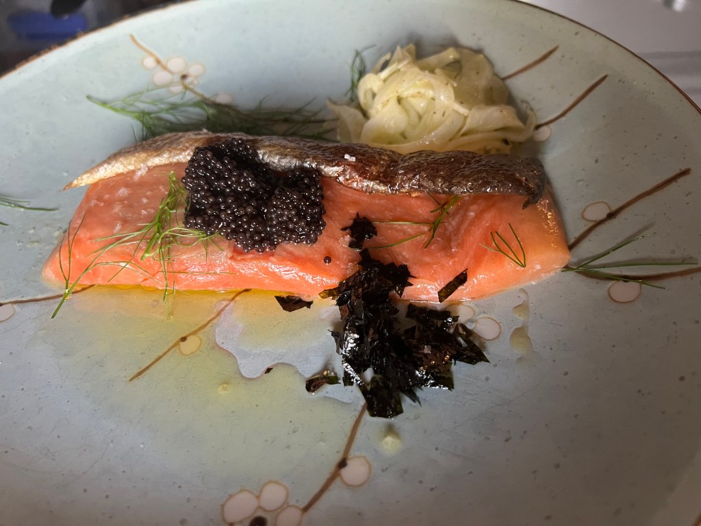Mrs B: Trout, caviar, fish skin, fennel salad wonderful.