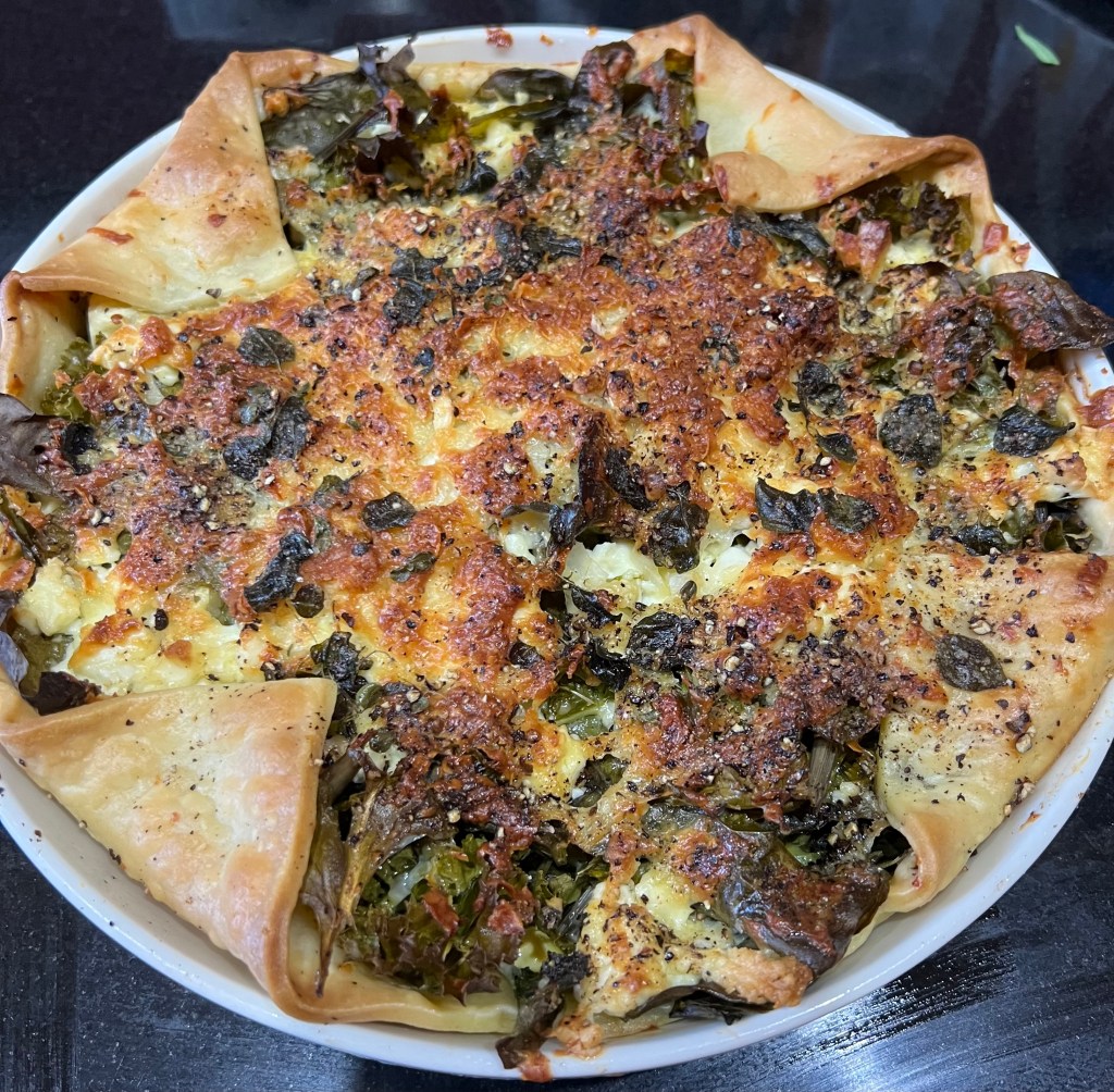 Spinach, kale, garlic, halloumi, feta, oregano, eggs, cream and shortcrust pastry.