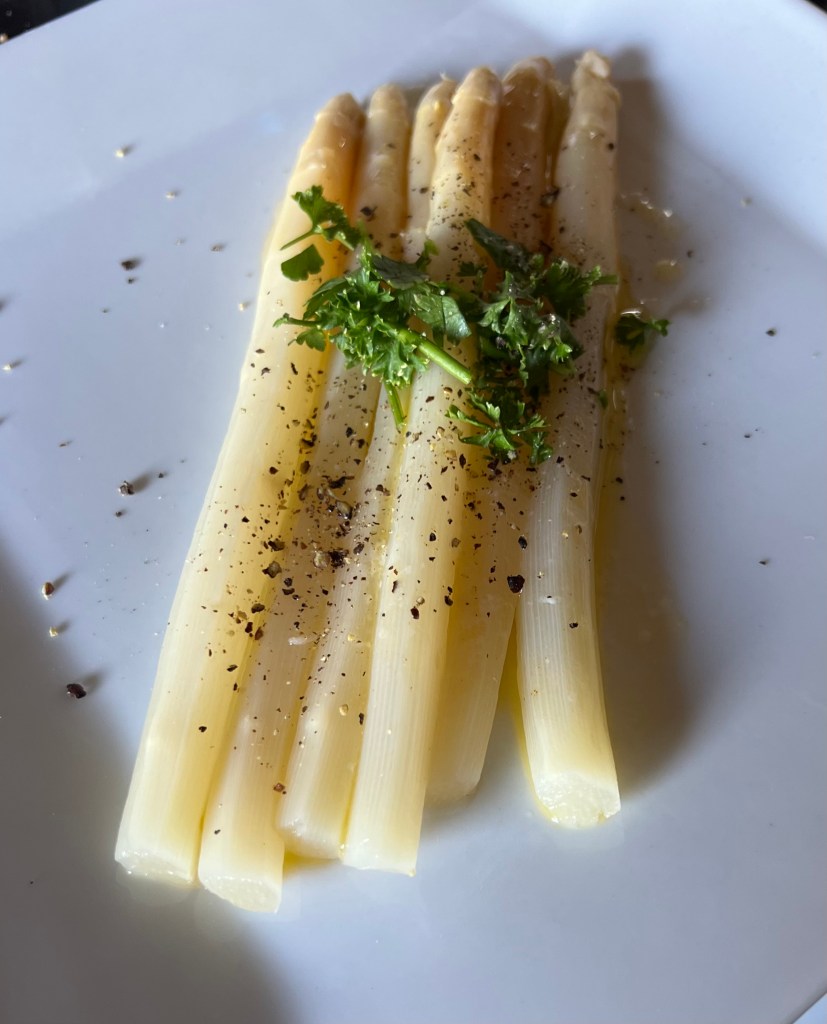 White Asparagus Spears (from Aldi) heated in sous vide at 50C for about 30mins and served with melted KerryGold butter (Ireland), and chopped parsley. Excellent