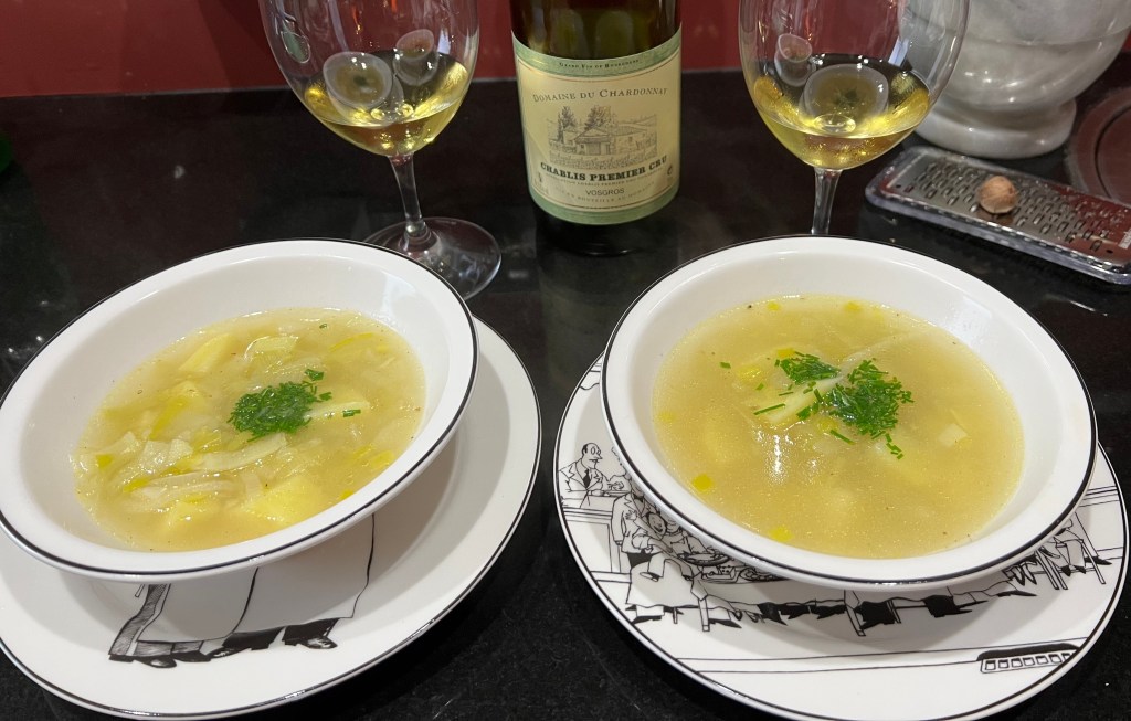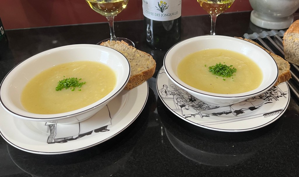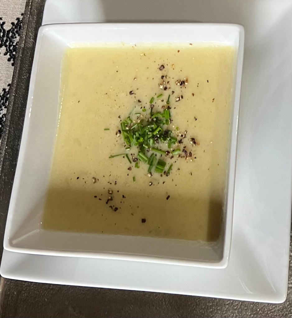 Vichyssoise (purée bonne femme enriched with creme and served cold) with lumpfish caviar and dill.)