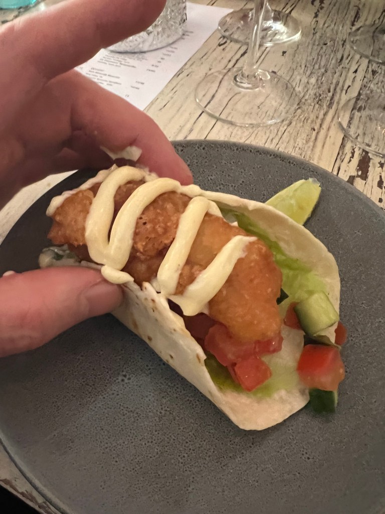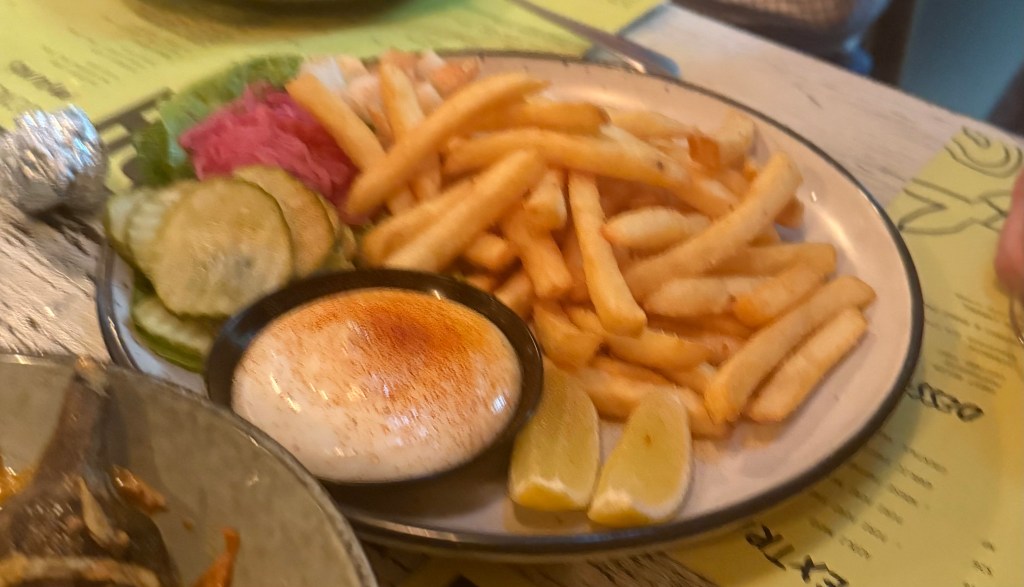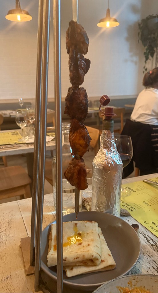 FICH SHISH (Monkfish with mixed spice marinade, flatbread, radish, dill pickles, chips, garlic sauce)