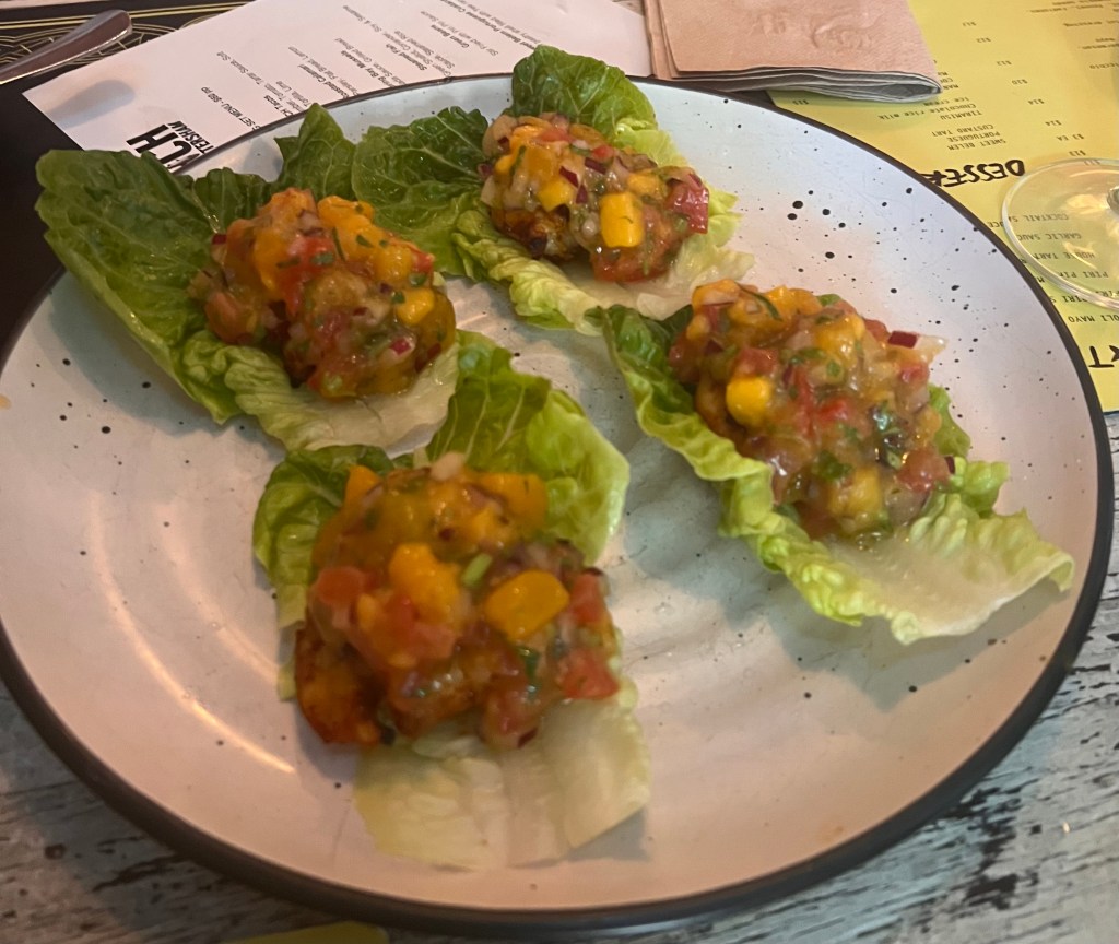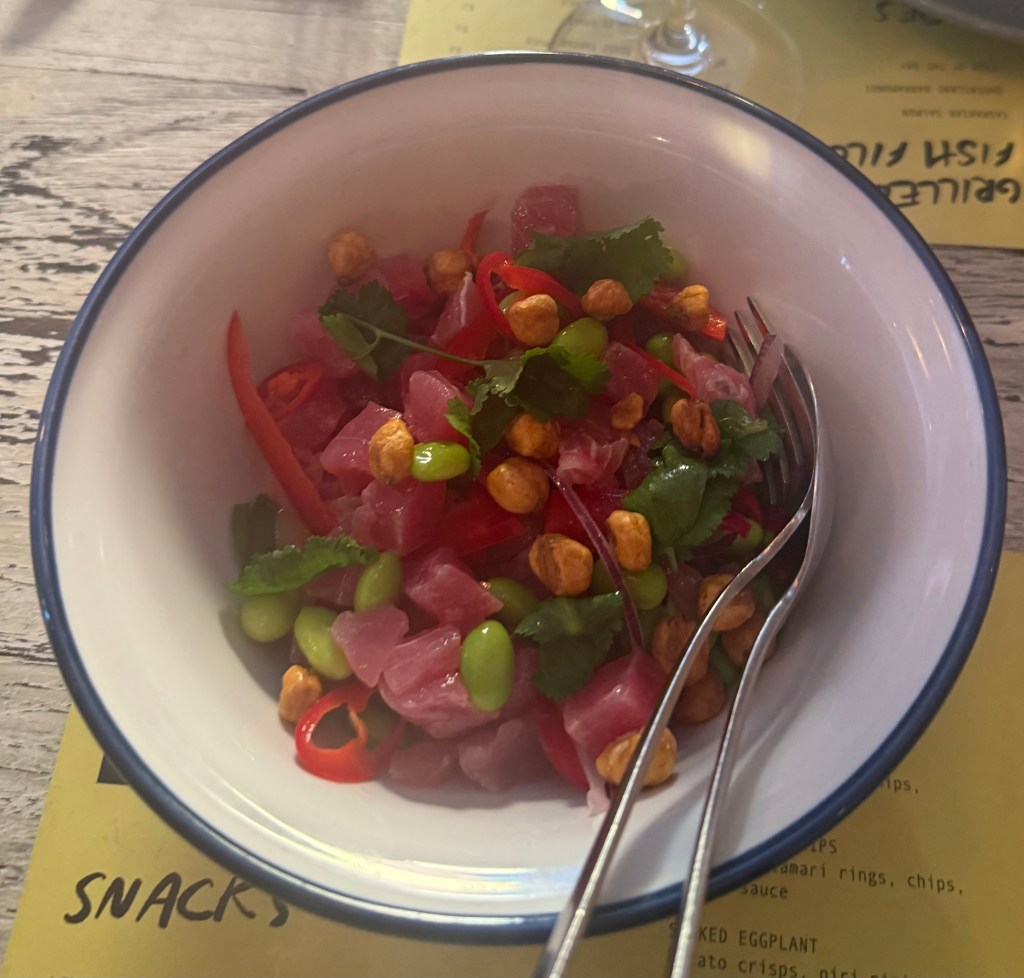 ALBACORE TUNA CEVICHE (Red onion, red capsicum, chilli, edamame, crispy corn, leche de tigre, rye crackers). Delicious!