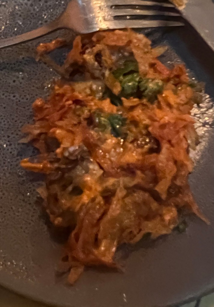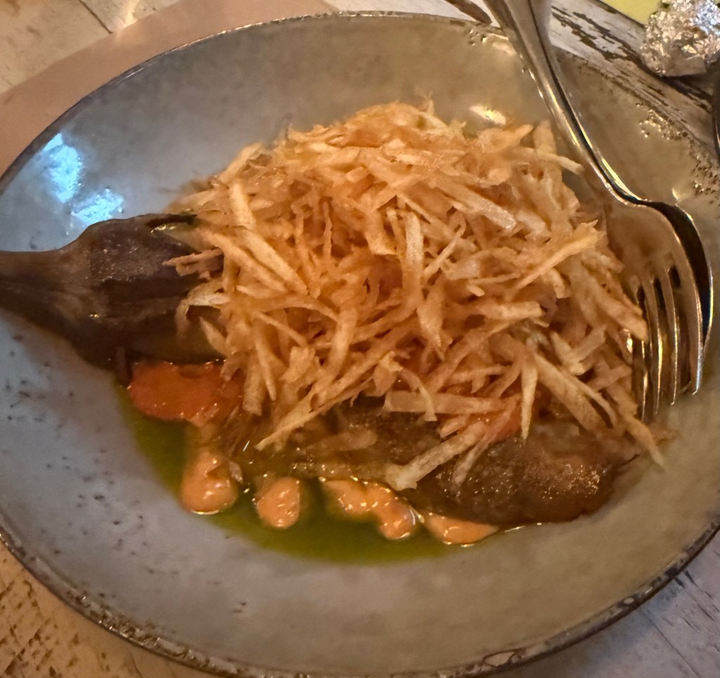 SMOKED EGGPLANT (Potato crisps, piri pir sauce, coriander, shallot oil)