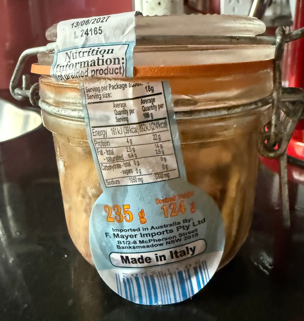 I used anchovies in a jar instead of white anchovies, and capers for caperberries.