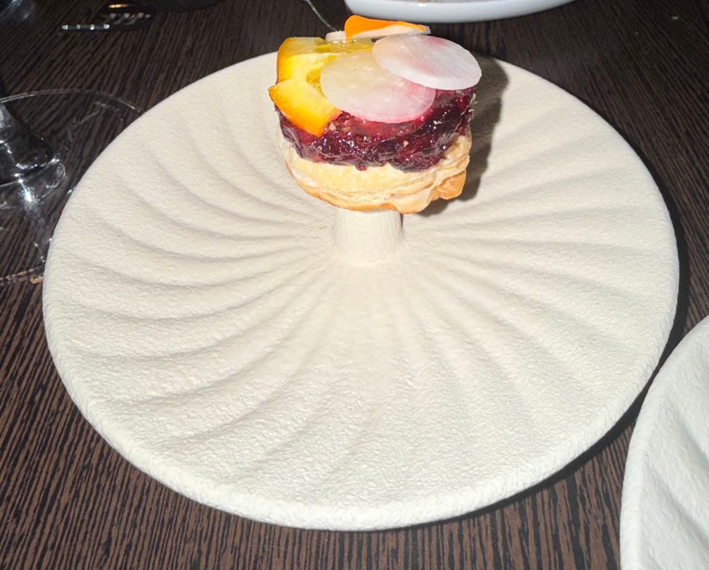 THAI SPICED DUCK WITH AGED BEETROOT ON PUFF PASTRY, CITRUS AND RADISH