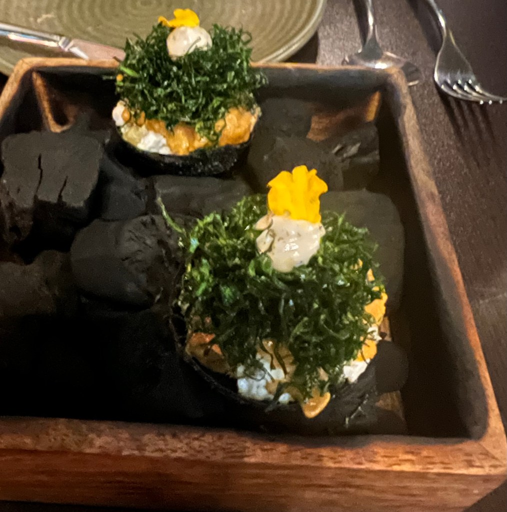 SMOKED CORNFED CHICKEN TARTLET, CRISPY CHINESE BROCCOLI, CAPER, AND ANCHOVIES W SEA URCHINS