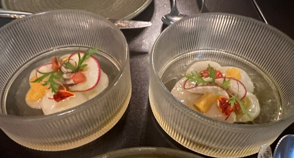 COOKED SCALLOPS AND CHILLED SPICY TOM YUM SOUP, SEMI DRIED TOMATO, MUSHROOMS, AND CORIANDER