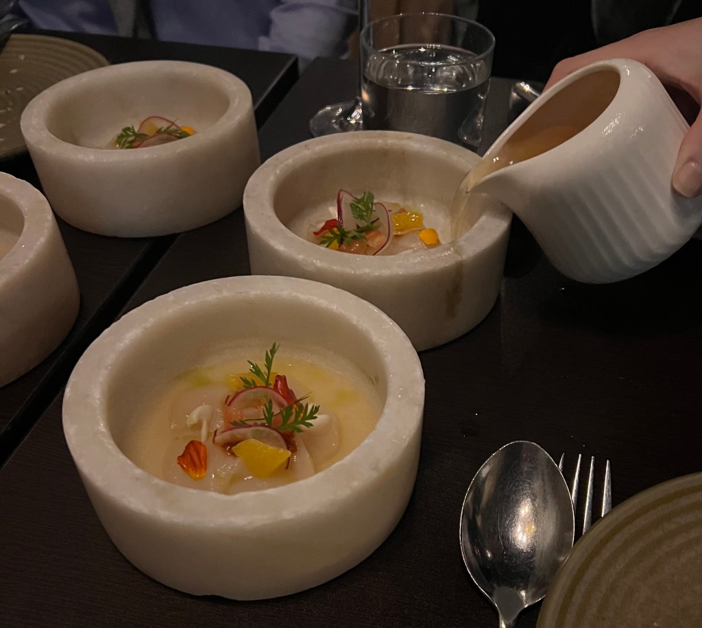 STEAMED EGG CUSTAR WITH THAI TOM KHA BROTH, CHIVE AND TOBIKO