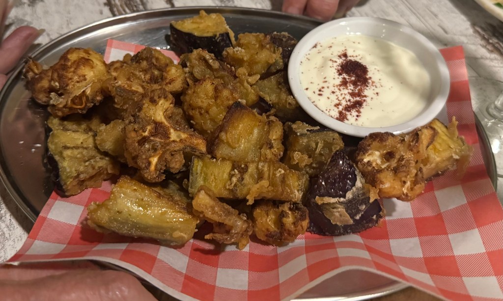 FRIED CAULIFLOWER & EGGPLANT (Baharat spiced lightly battered cauliflower & eggplant, garlic yoghurt)