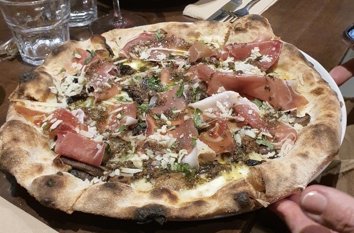 TARTUFATA PIZZA (Fior di latte, mixed wild mushrooms, prosciutto, truffle paste, parmesan)