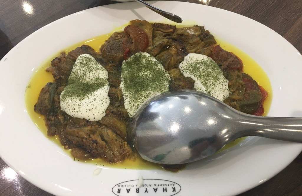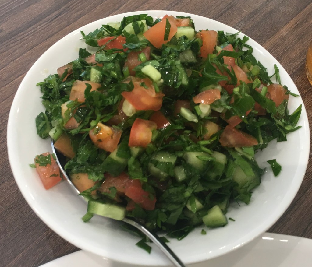 KHAYBAR SALAD (Ripe sliced tomatoes, red onions?, mild garlic and fresh mint in a lemon dressing)