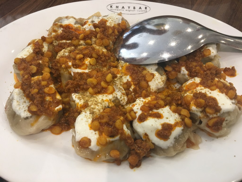 MANTU MAIN (Steamed dumplings filled with chopped beef and onions, topped with yogurt and beef mince)