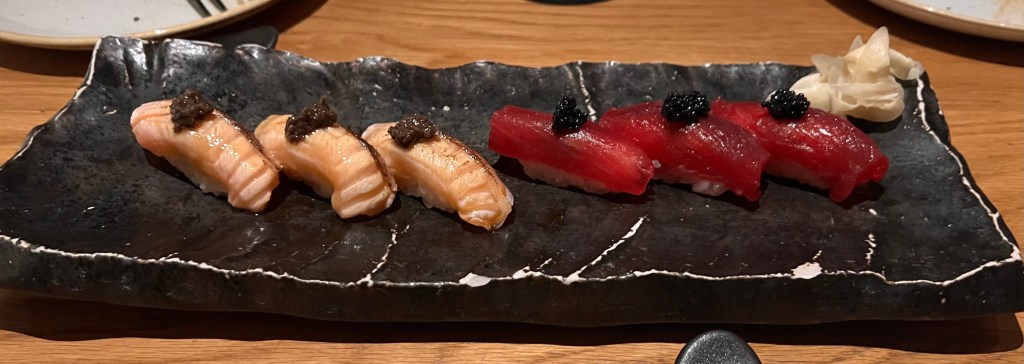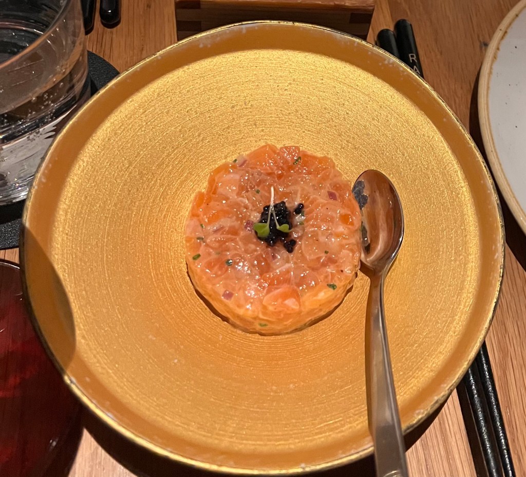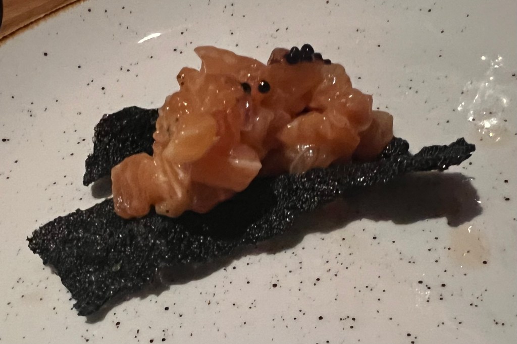 TASMANIAN SALMON TARTE W YUZU MISO & SQUID INK CRACKER