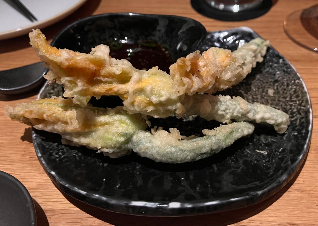 TEMPURA ZUCCINI FLOWER, FETA, GOMA, TOFU PASTE, DASHI BROTH