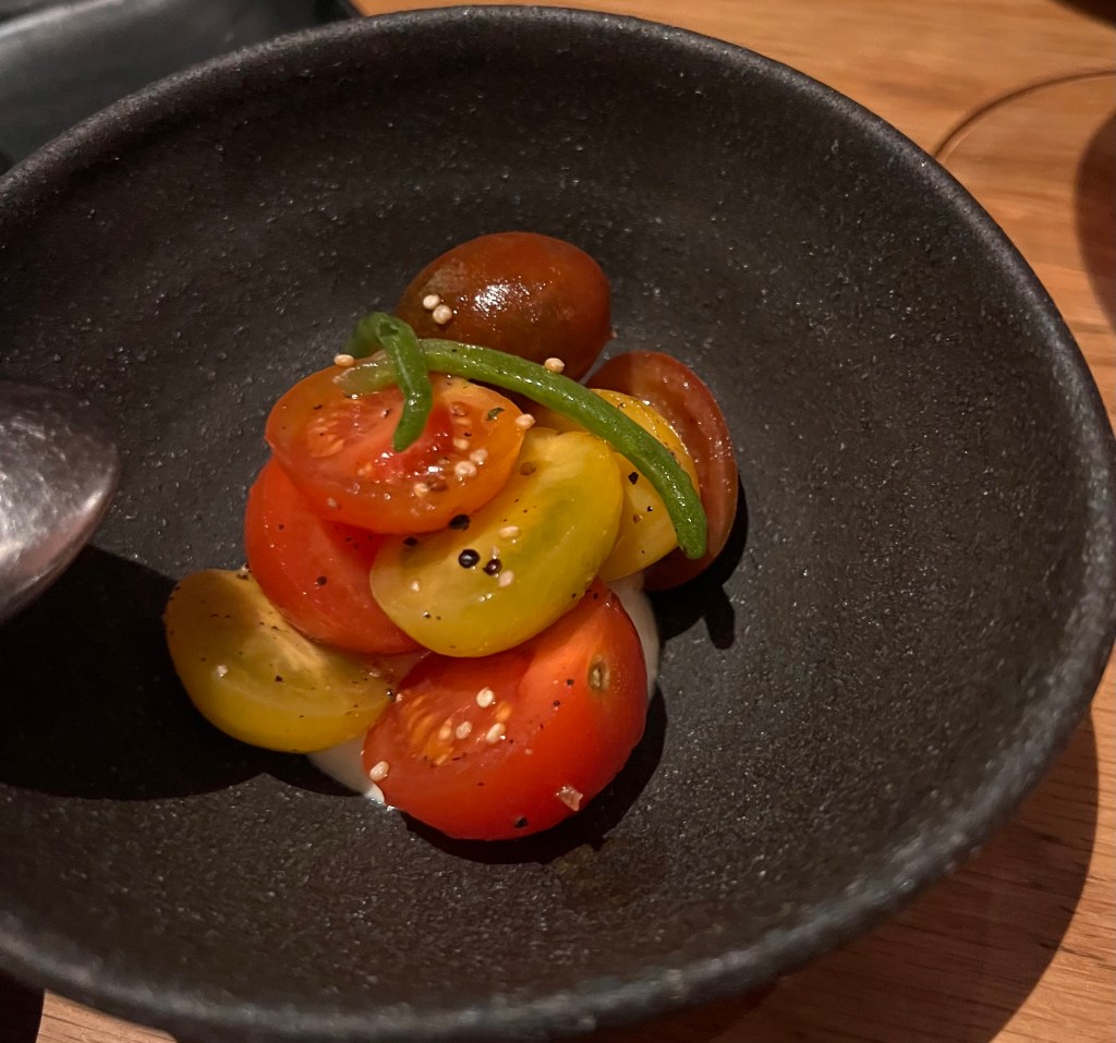 CHERRY TOMATO SALAD, FRIED QUINOA, HONEY SOY, SPICY TOFU CREME, SAMPHIRE