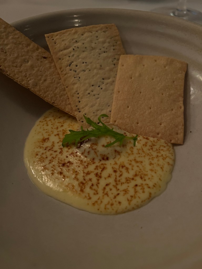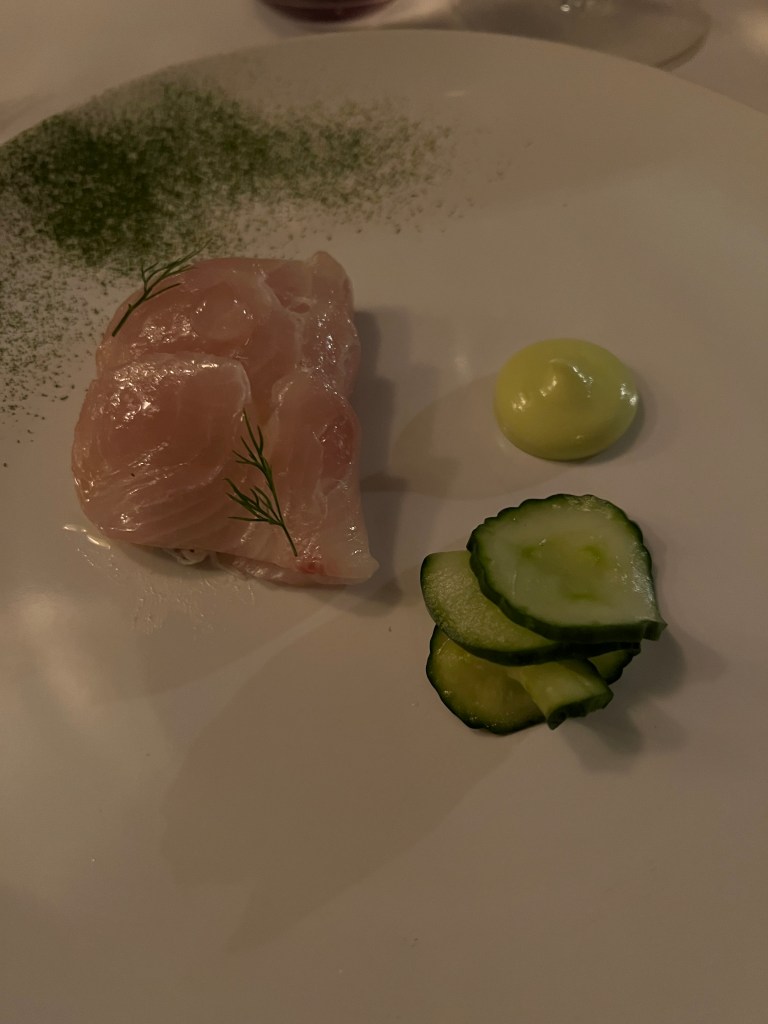 HIRAMASA KINGFISH, spanner crab, dill creme fraiche, rye, cucumber