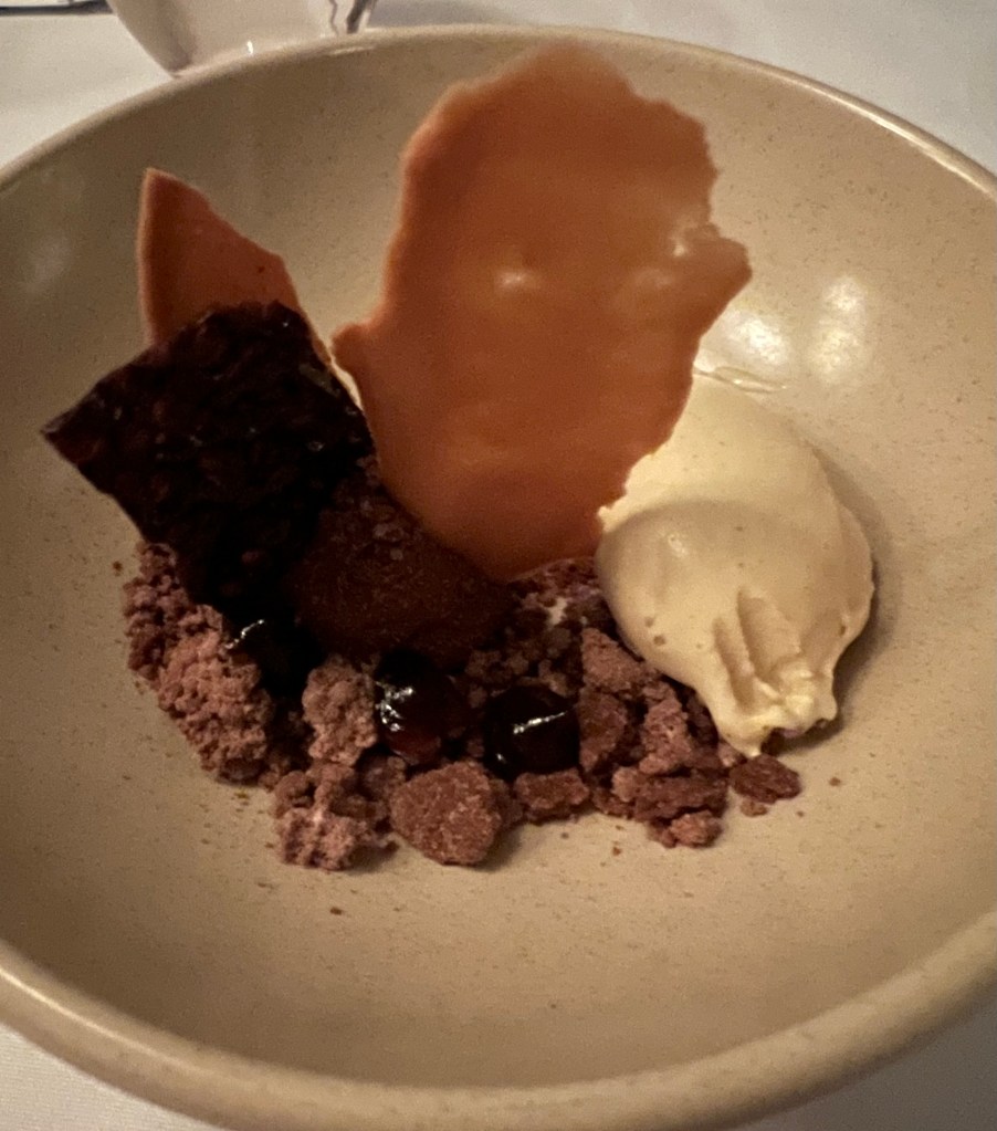 PRALINE MOUSSE TORTE, ganache, buttermilk sorbet