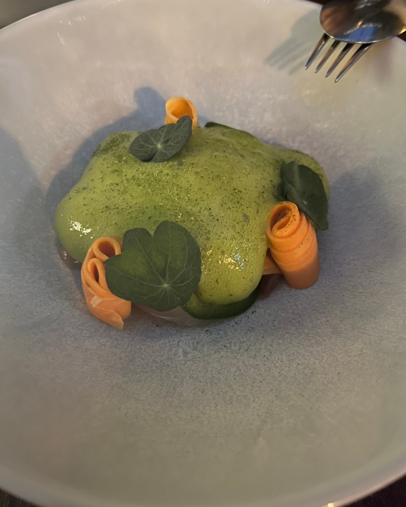 SNAPPER TIRADITO, FERMENTED SWEET POTATO, JALAPENO, LECKE DE TIGRE FOAM