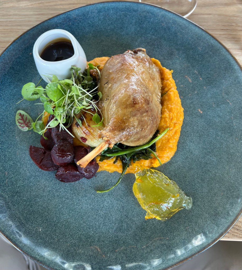 CONFIT DUCK MARYLAND house made kumquat marmalade, escallops, baby beets, butternut puree, sautéed spinach, jus