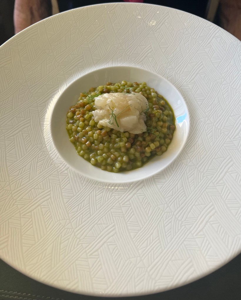 FREGOLA ALLA MANIERA DI UN RISOTTO, SALSA AL PREZZEMOLO, ROMBO MARINATO E BOTTARGA DI UOVO (Fregola pasta from Sardinia with parsley sauce, cured turbot fish, marinated egg yolk)