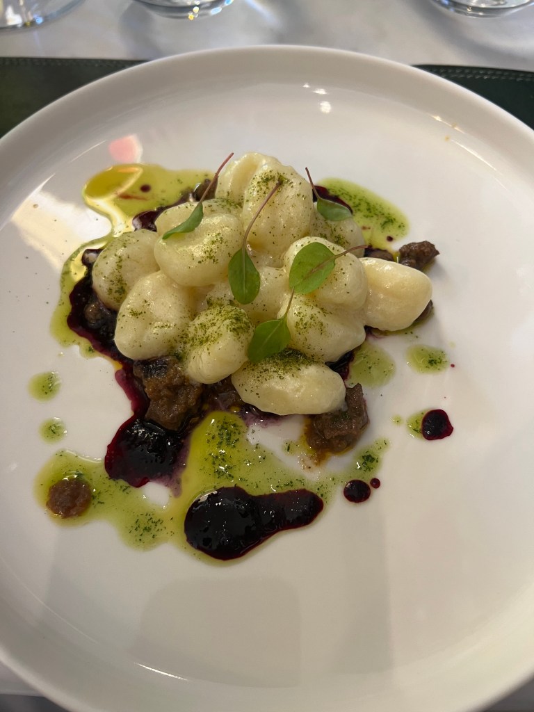 GNOCCHETTO DI PATATE, RAGU DI CAPRIOLO, BURRO ACIDO E SALSA AI MIRTILLI (potato gnocchi, venison regular, sour cream and blueberry sauce)