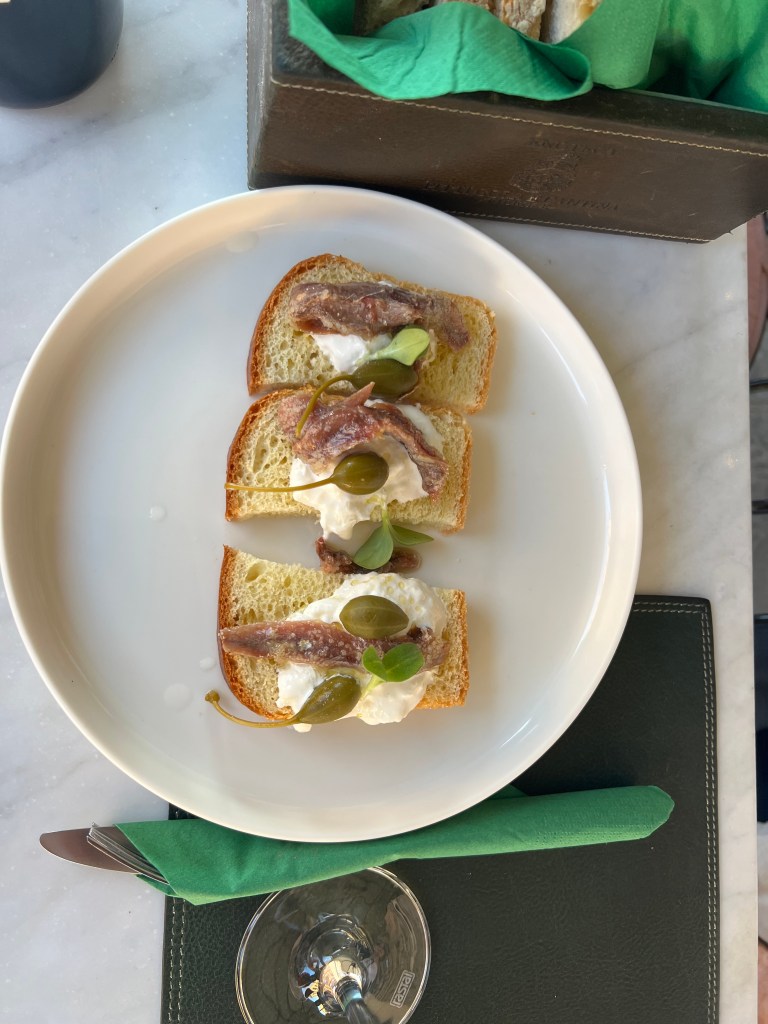 PAN BRIOCHES CON STRACCIATELLA DI BURRATA, ACCIUGHE E FRUTTO DEL CAPPERO (Brioche bread served with a creamy Burrata cheese, anchovies and caper berries)