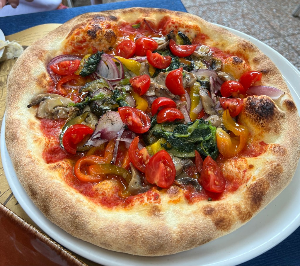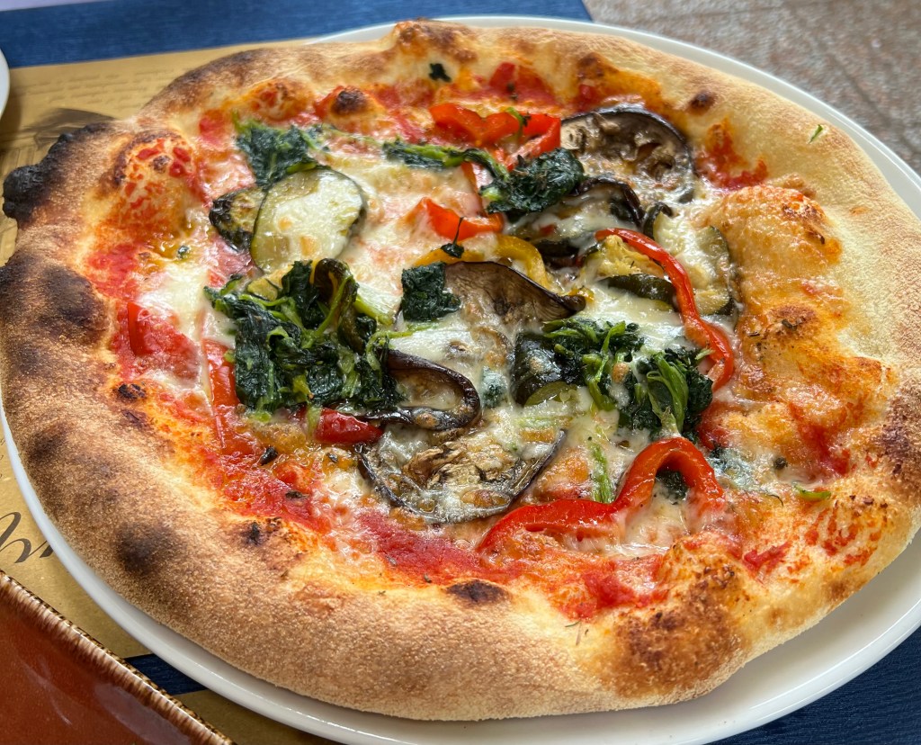 PIZZA VEGANA (RACHEL) (Tomato sauce, aubergines, peppers, zucchini, red onion, turnip tops, mushrooms, tiny fresh tomatoes, oregano)