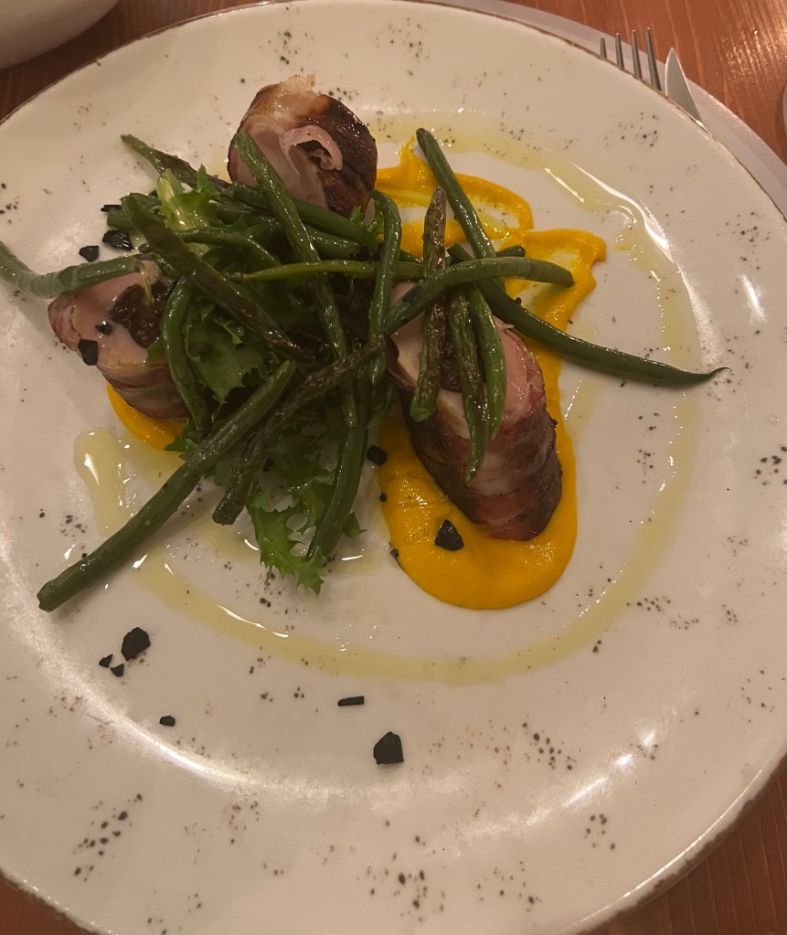 FARAONA LARDELLATA CON PRUGNE, FAGIOLINI SALTATI E CREMA DI CAROTE AL GINGER (Larded guinea fowl with prunes, sautéed steamed green beans and ginger carrot cream)