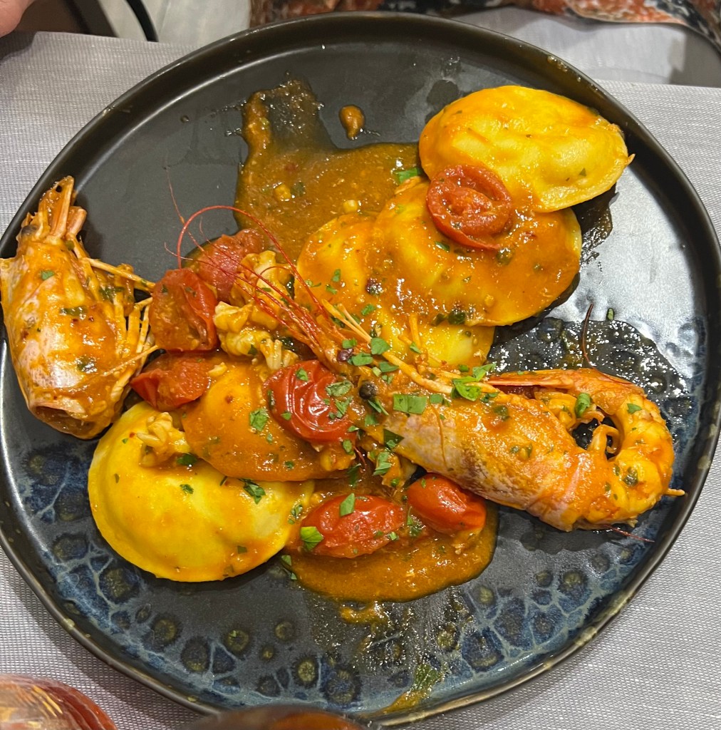 RAVIOLO RIPIENO DI CROSTACEI CON VELLUTATA DI MARE E POMODORINO CONFIT Ravioli Pasta stuffed with shellfish with cream of the sea and tomato confit